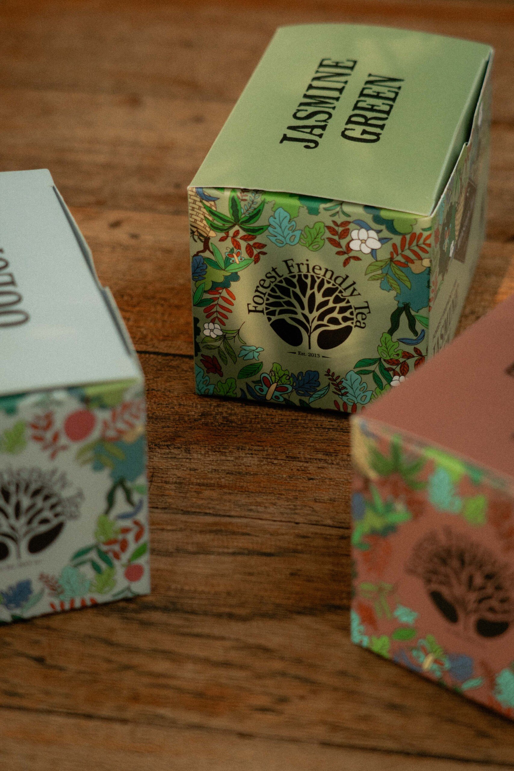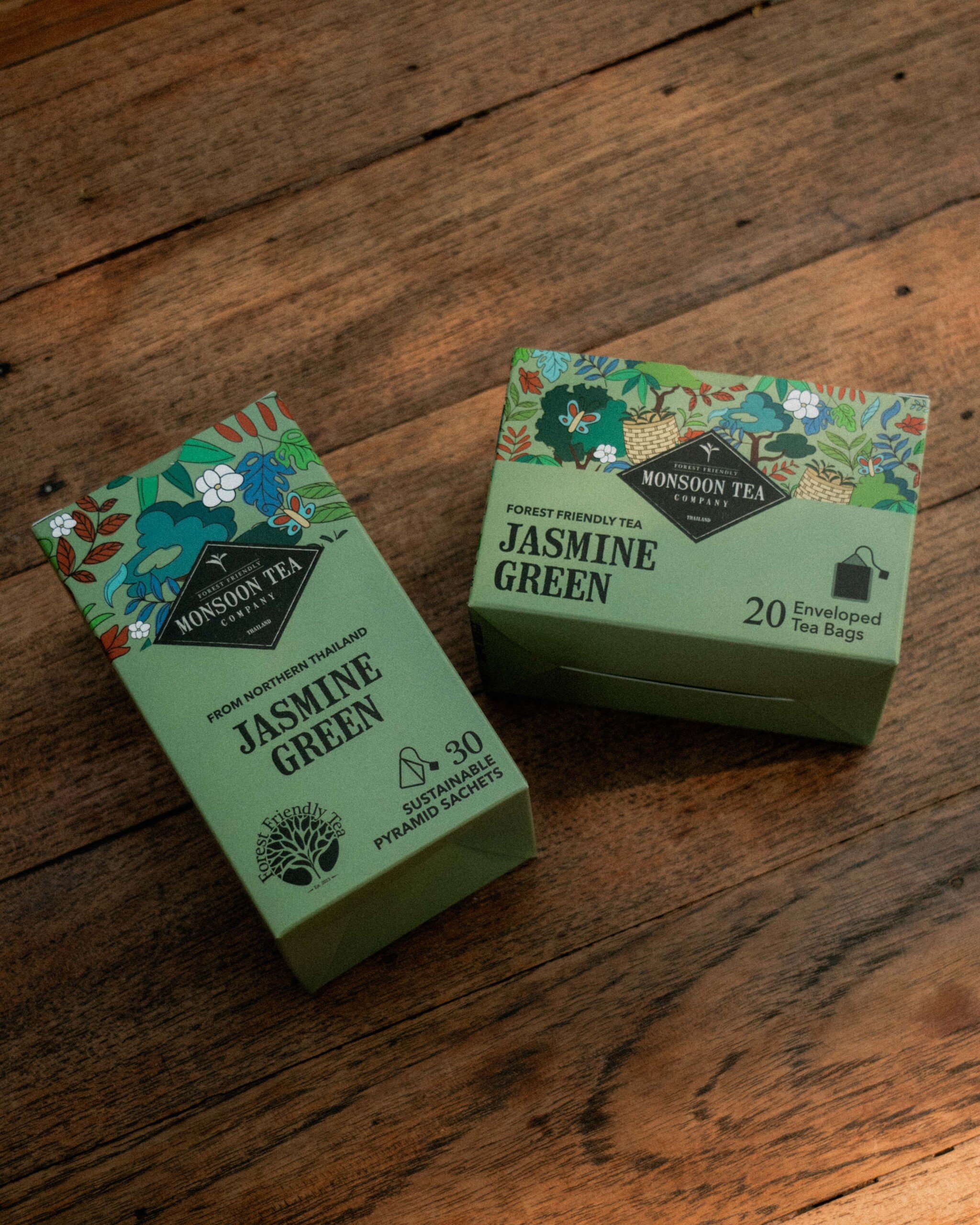 Introducing our new tea bag boxes! Jasmine Green is one of our most popular teas made by mixing a slightly sweet, grassy green tea with jasmine. Our green tea is grown in harmony with nature in Northern Thailand without the use of pesticides, fertilisers or irrigation systems.