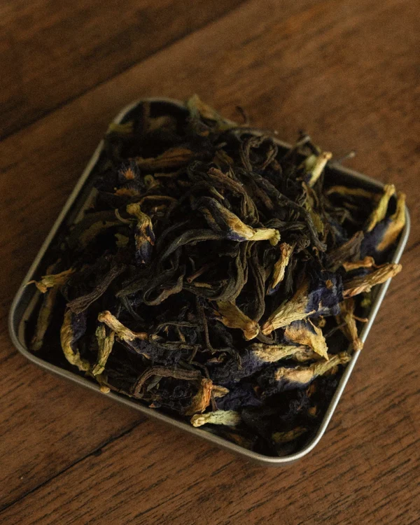The ‘Rabbit Blend’ is a Green Tea flavoured with butterfly pea flower and longan. / Electric blue