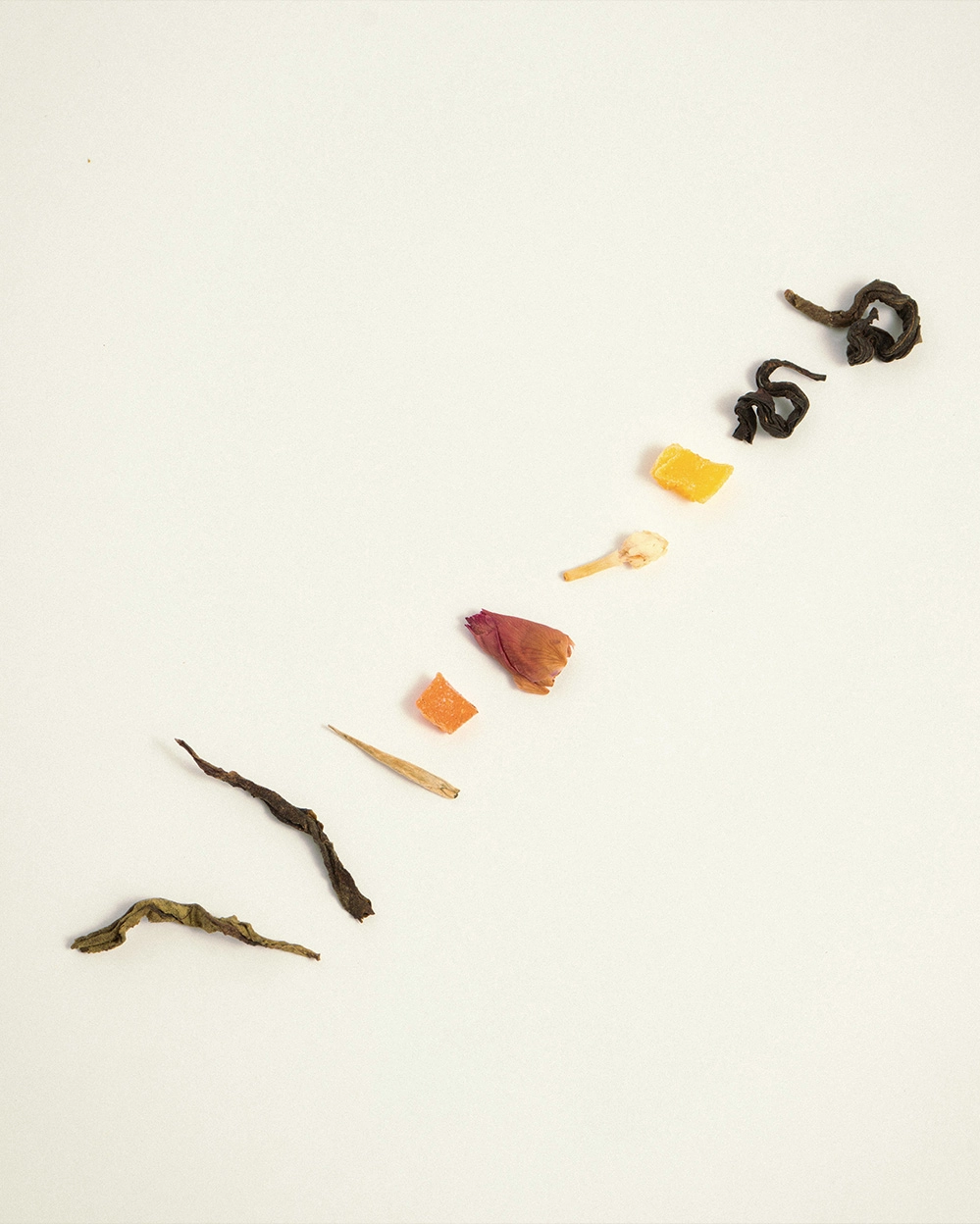 白茶、黒茶、緑茶、烏龍茶、黄茶、マンゴー、パパイヤ、パッションフルーツ、バラ、ジャスミン。