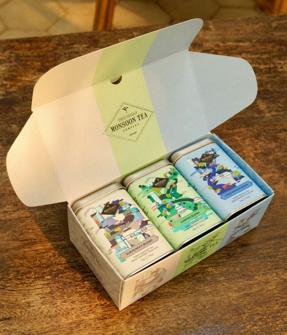 含税探索 BKK 拼配茶礼盒,这是来自 Bangkok Blends 系列的精选组合。礼盒内包含三款标志性风味:Lumpini 拼配、Sukhumvit 拼配以及 Chao Phraya 拼配(每款均采用优雅的 50 克罐装呈现)。